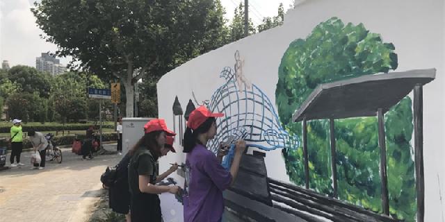 ■图说:社区居民正在正在真南路和新村路路口的围墙上绘画