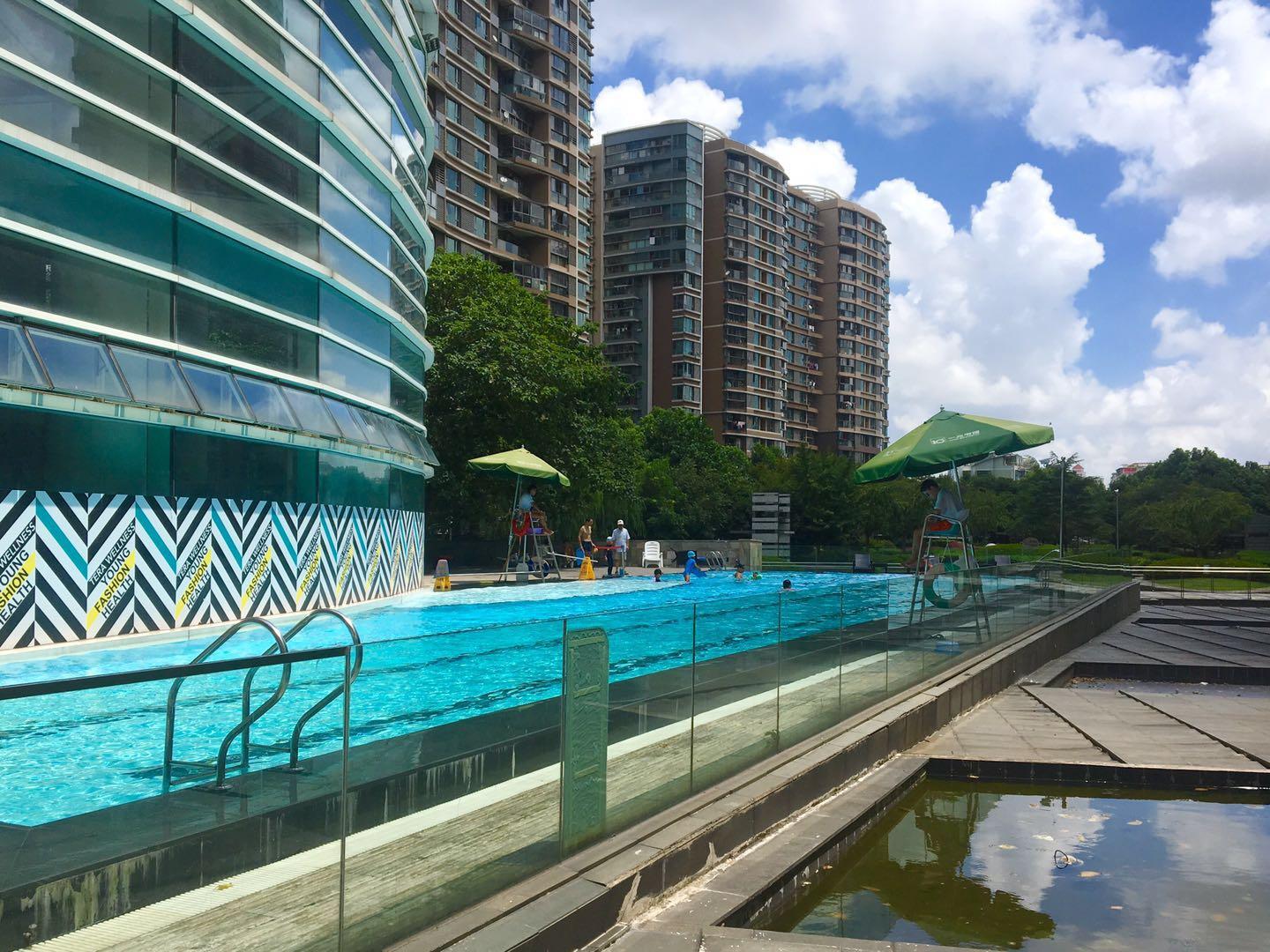 周到君从地铁上海马戏城站4号口出来,走路5分钟到达新梅共和城小区,1号门走进去,根据地图指示,很快就找到了隐藏在小区里的新梅共和城游泳池。