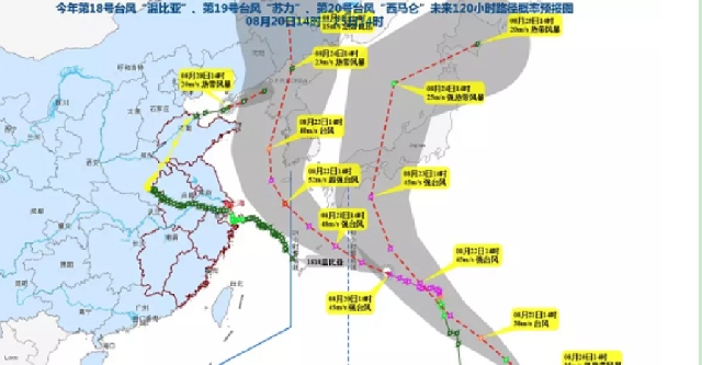 今年第19号台风“苏力”的今天下午位于距离日本九州岛东南方向约880公里的洋面上。预计未来24小时内,该系统将以约23公里/小时的速度向西偏北方向移动,强度逐渐增强。于明天进入东海东部海面,以后逐渐转向西北到偏北方向移动,将在我国东海东部和黄海南部偏东海区北上。
