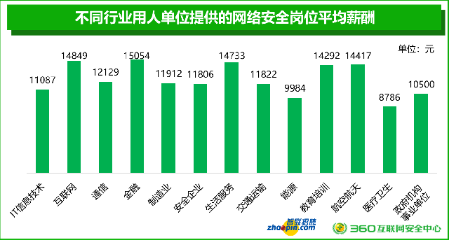 金融行业相关用人单位给网络安全人才提供的薪酬最多,平均约为15054元/月,其次为互联网行业,平均薪酬为14849元/月,生活服务行业平均薪酬为14733元/月。