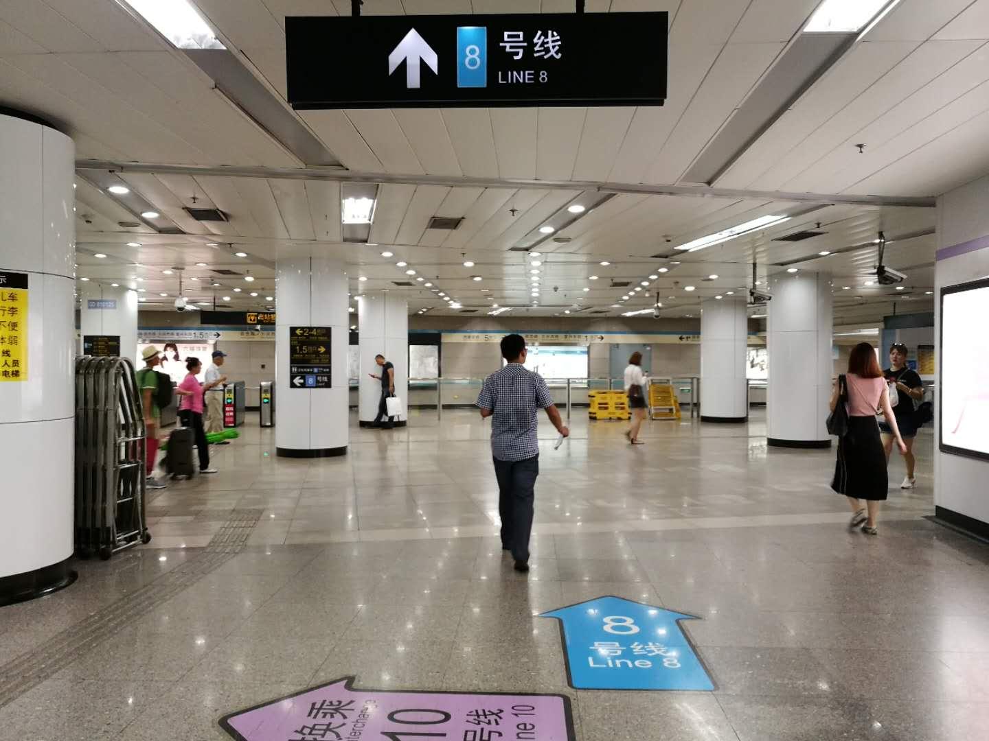 从周到君拍到的全景图上可以看到,左手边和右手边是8号线的手扶梯和楼梯位置,正对面是10号线的手扶梯和楼梯位置,而周到君刚刚出站的无障碍电梯在图片右手边站外的位置。