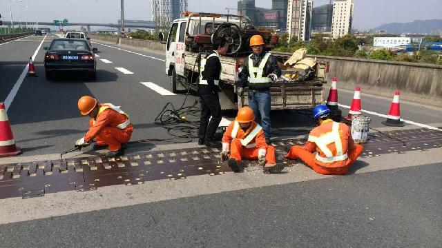 为了不影响交通,工程全部为夜间施工,封道时间为0:00至5:00时。工作人员启动“手术”内容主要是桥面伸缩缝的更换施工,其中包括破除混凝土、拆除型钢、种植扩底螺栓、加工焊接钢筋笼、安装伸缩缝、浇筑混凝土等工序,因此每处伸缩缝更换需要至少两天的施工周期才能完成。