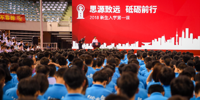 9月9日晚,上海交大2018级新生在闵行校区霍英东体育中心迎来“开学第一课”,上海交大党委书记姜斯宪以“思源致远•砥砺前行”为主题,与同学们溯源交大历史、概览今日交大,并深情寄语这群即将开启人生新篇章的“新交大人”。