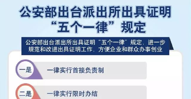 据公安部消息,为切实解决社会反映强烈的“奇葩证明”问题和个别部门随意要求群众到派出所开具证明等问题, 近日,公安部制定出台《公安派出所出具证明“五个一律”工作规定》(以下简称《规定》)。《规定》明确,群众到公安派出所申请出具证明,接待询问的首位民警为首接责任人,负责对办理事项进行全程盯办。