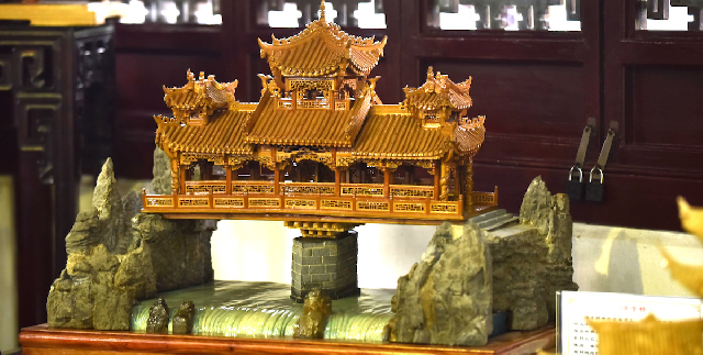 逸野堂内,展示的是土家族竹雕,这些作品由第一届中国工艺美术大师王仕辉制作。作品从设计、选材、开眼、凿榫等工序完全按土家族特色建筑的修建流程和方法进行,将湘西优质楠竹为材料微缩于掌上,在盈盈方寸间雕刻缔造了一个微缩的“土家世界”。