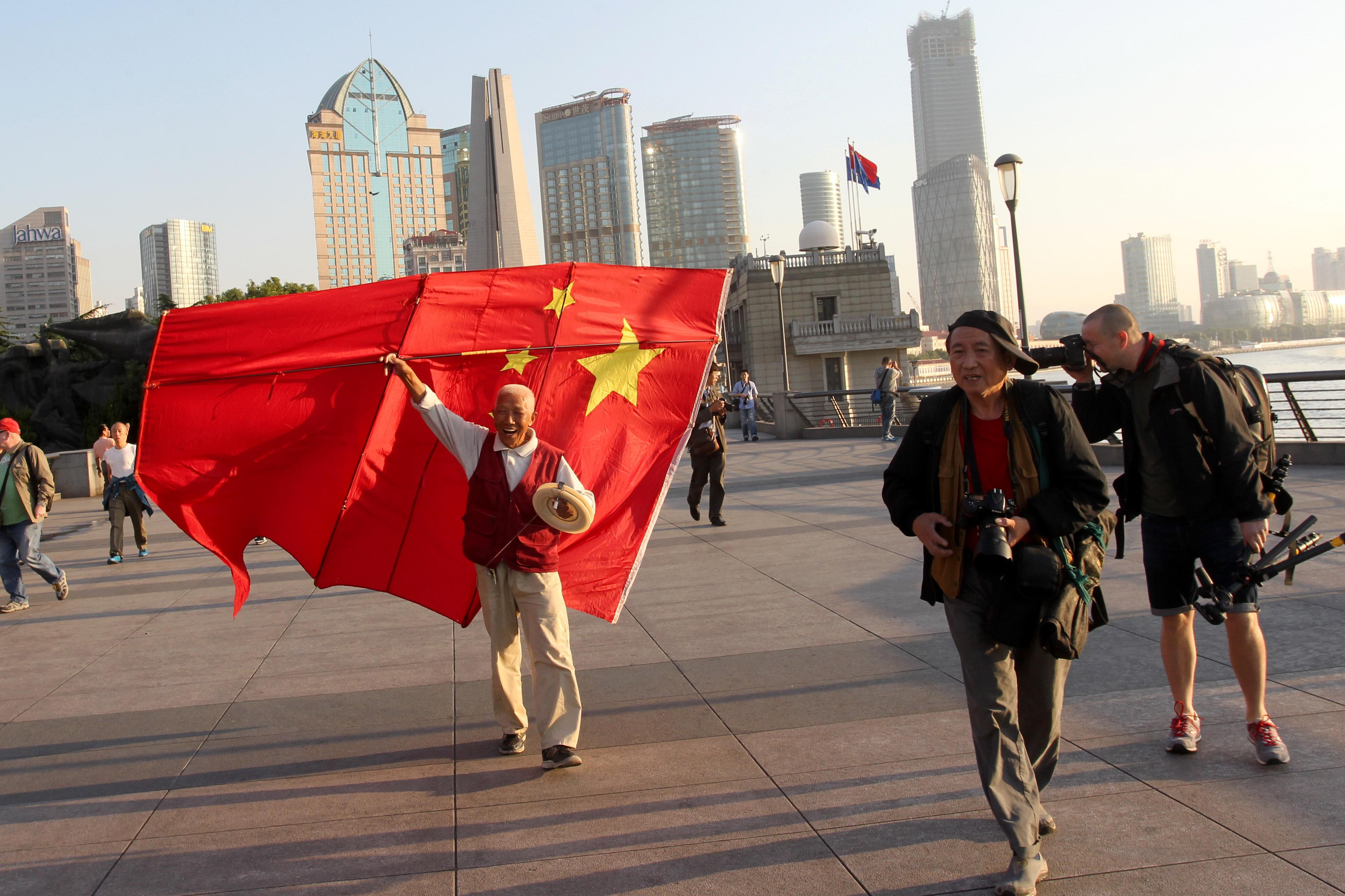 这不到了国庆节,就轮到老顾那个长四米宽三米的巨型五星红旗风筝迎风飘扬了。以前这样大的风筝也许还很让人惊讶,不过现在在宽敞的外滩亲水平台上以及一望无垠的碧蓝天空中,大家倒是“见怪不怪”了。
