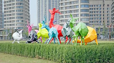 位于松江新城国际生态商务区中央绿地西侧的大型雕塑群“十鹿九回头”日前落成。十只色彩靓丽、形态各异的不锈钢烤漆梅花鹿十分惹眼,为商务区再添一道新风景。