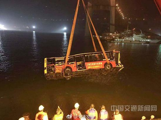 10月31日晚11点30分左右,重庆万州坠江公交车被打捞出水。