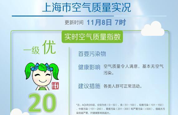 根据上海空气质量实时发布系统的消息,今早空气质量优,实时指数20,来关注下今早空气质量。早7时,全市PM2.5平均浓度为7,最高的虹口凉城(凉城路854号)13,最低的浦东监测站(灵山路51号)2。实时空气质量指数20,优。