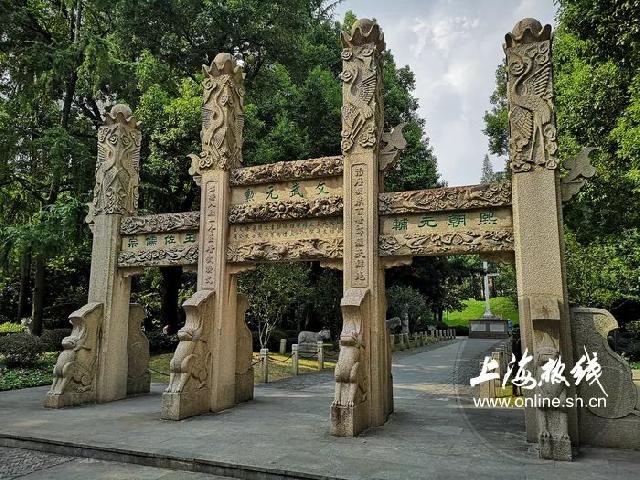 公园入口处就是牌坊,石牌坊刻有对联:“治历明农百世师经天纬地,出将入相一个臣奋武揆文”。