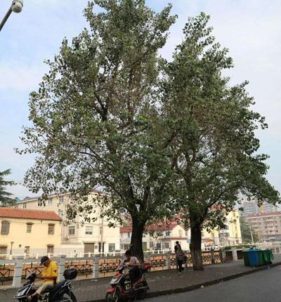 至于树种问题,也是莫衷一是。最多的说法是白杨树,也有说杨树、槐树的。为此我请教大学留校的G同学,传去拍摄的树干、枝叶图像,经过上海交通大学生命学院褚建君老师辨认,认为是加拿大杨树。其形态特证:落叶乔木,高30多米。干直,树皮粗厚,深沟裂,下部暗灰色,上部褐灰色,大枝微向上斜伸,树冠卵形;萌枝及苗茎棱角明显,小枝圆柱形,稍有棱角,无毛,稀微被短柔毛。芽大,先端反曲,初为绿色,后变为褐绿色,富粘质。单叶互生,叶呈三角形或三角状卵形,长7-10厘米,长枝萌枝叶较大,长10—20厘米,一般长大于宽,先端渐尖,基部截形或宽楔形,无或有1—2个腺体,边缘半透明,有圆锯齿,近基部较疏,具短缘毛。