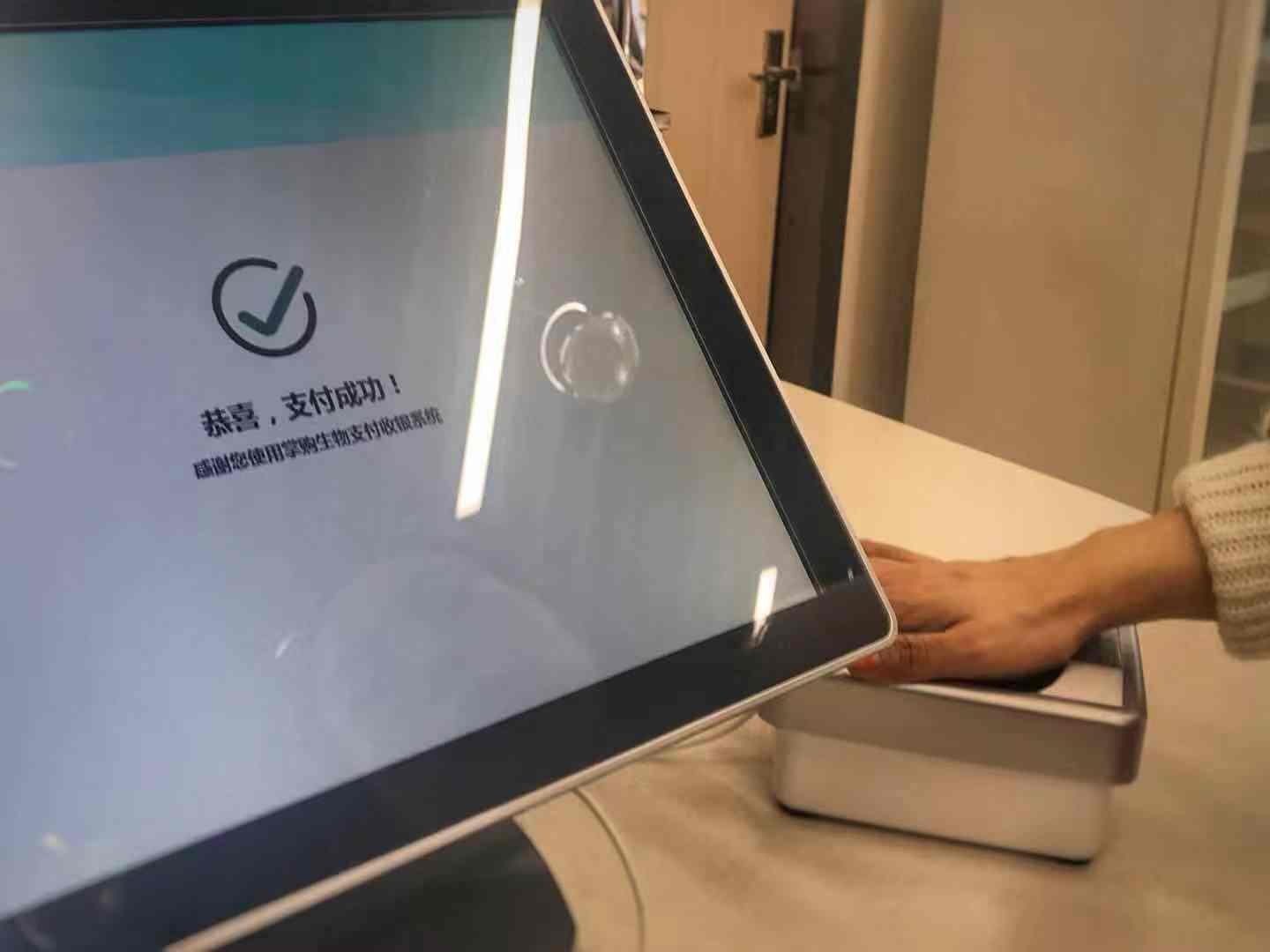 随后,周到君在选购完商品后前往付款处,将右手轻轻放置到掌静脉付款机上,几秒之间便完成了付款,