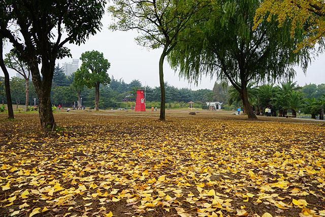 周到君发现,银杏落叶落在草地上,草地是被围起来的,自然形成一片落叶景观地。