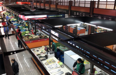 菜市场共有中央摊位39个,包房32间,中央通道的每个摊位之间都增加了隔断,并新增了两处回旋通道。