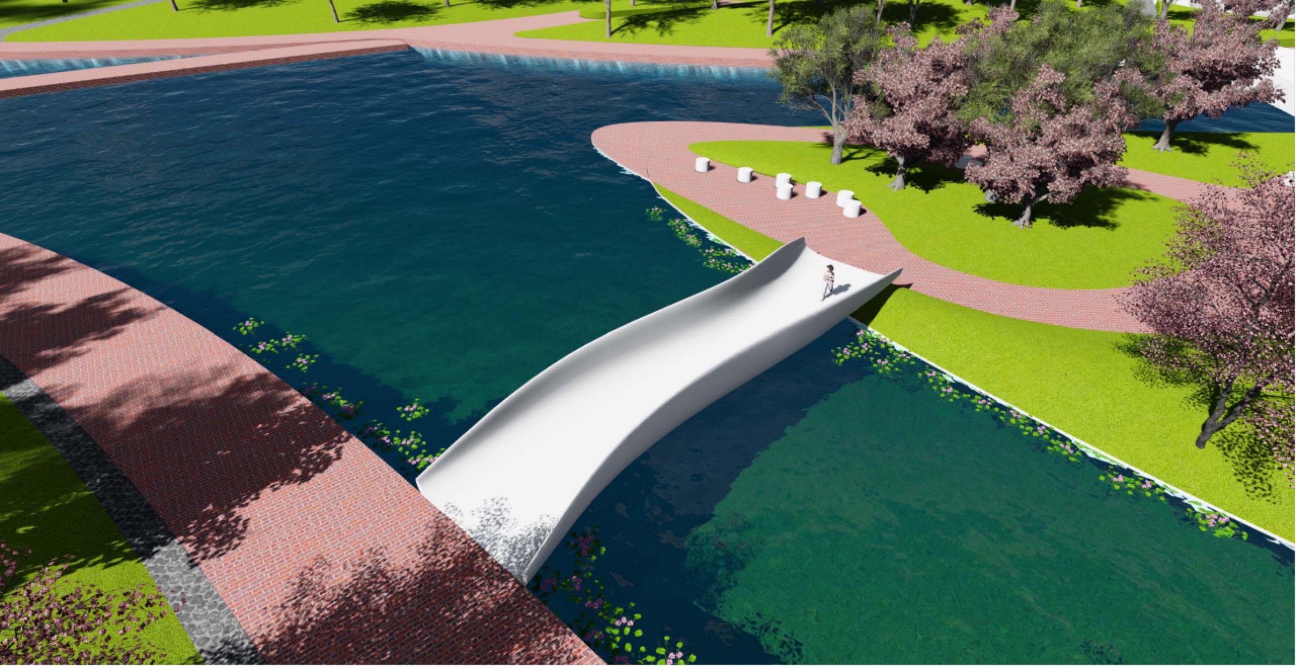 根据效果图显示,这座建成后将用于桃浦中央绿地内一座小岛与沿岸的连接通道。而根据桃浦智创城相关管理方提供的位置示意图,可知该桥的计划建造地点位于普陀区桃浦中央绿地近武威路一侧。该地点属于中央绿地区域3期工程,目前尚在建设之中。
