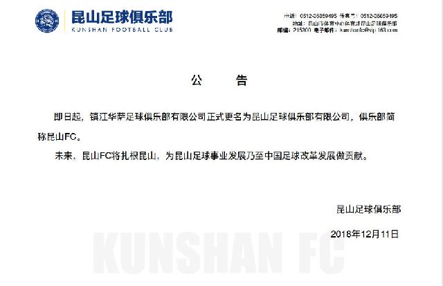 即日起,镇江华萨足球俱乐部有限公司正式更名为昆山足球俱乐部有限公司,俱乐部简称昆山FC。