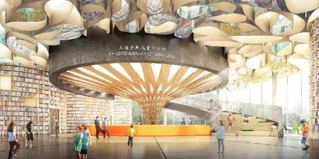 上海少儿图书馆新馆内部分布有大小不同、高低起伏的圆形书架,结合通高中庭、螺旋楼梯等形成一阅读的森林、书籍的海洋,呈现出一种与博尔赫斯设想的巴别图书馆一致的空间效果。