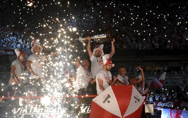 随后,河床全队戴上礼帽手举奖杯乘坐敞篷大巴在球场内绕场一周,看台上的球迷打开手机照明灯和球员互动,现场焰火礼花绽放,彩带纸屑飞舞。气氛火爆,球场仿佛被点燃一般,特别震撼。对于一支球队和他们的球迷来说,最幸福的时刻莫过于此。