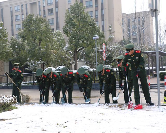 清晨上海的温度已在零度以下,武警官兵们身着一身绿装,嘴上哈着热气,手上拿着工具认真地除着雪。这次除雪活动主要针对营区周便的小区内部道路,小区出入口、公交车站台附近等行人经常经过的路段。