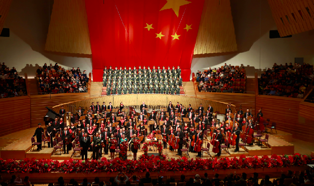 昨晚的音乐会现场,巨幅红旗下,上交男女乐手分别佩戴红色领结和丝巾,将音乐会现场点缀成一片喜悦的海洋。音乐会以在中国共产党领导下的中国革命历程为轴线,选取反映各个历史时期、特别是1949年新中国成立后有着深厚群众基础的歌曲,并邀请著名作曲家邹野操刀,用交响音乐的手段创作整理,使这些原创中国红色经典作品具有更强大的叙述性和戏剧性,展现中国红色魅力。