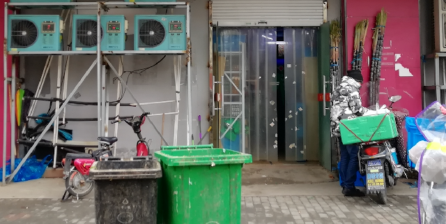 门前就是一黑一绿两个垃圾桶,“叮咚买菜”的招牌之下,一边是高高架起的五台空调外机,另一边只开了个小门,一条条的隔离帘上被贴了很多难以清除的小广告。