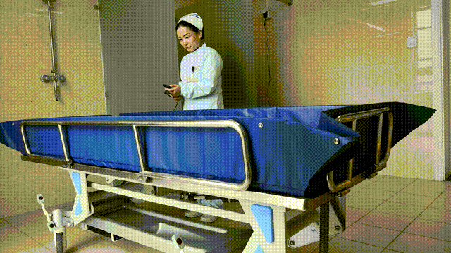 电动移位车是帮助老人从病床移动到浴室进行洗澡的设备,蓝色的床板可调节至与老人床位一样高,将老人移动到床板后用黑安全带进行固定,再由医护人员推至浴室,帮助老人进行洗澡。这样的设备使老人的洗浴操作一步到位,只要躺在上面就可以享受舒适的洗澡,不用担心站不稳、脚打滑等意外情况发生,也省去了人力搬动搀扶老人的麻烦和不便。