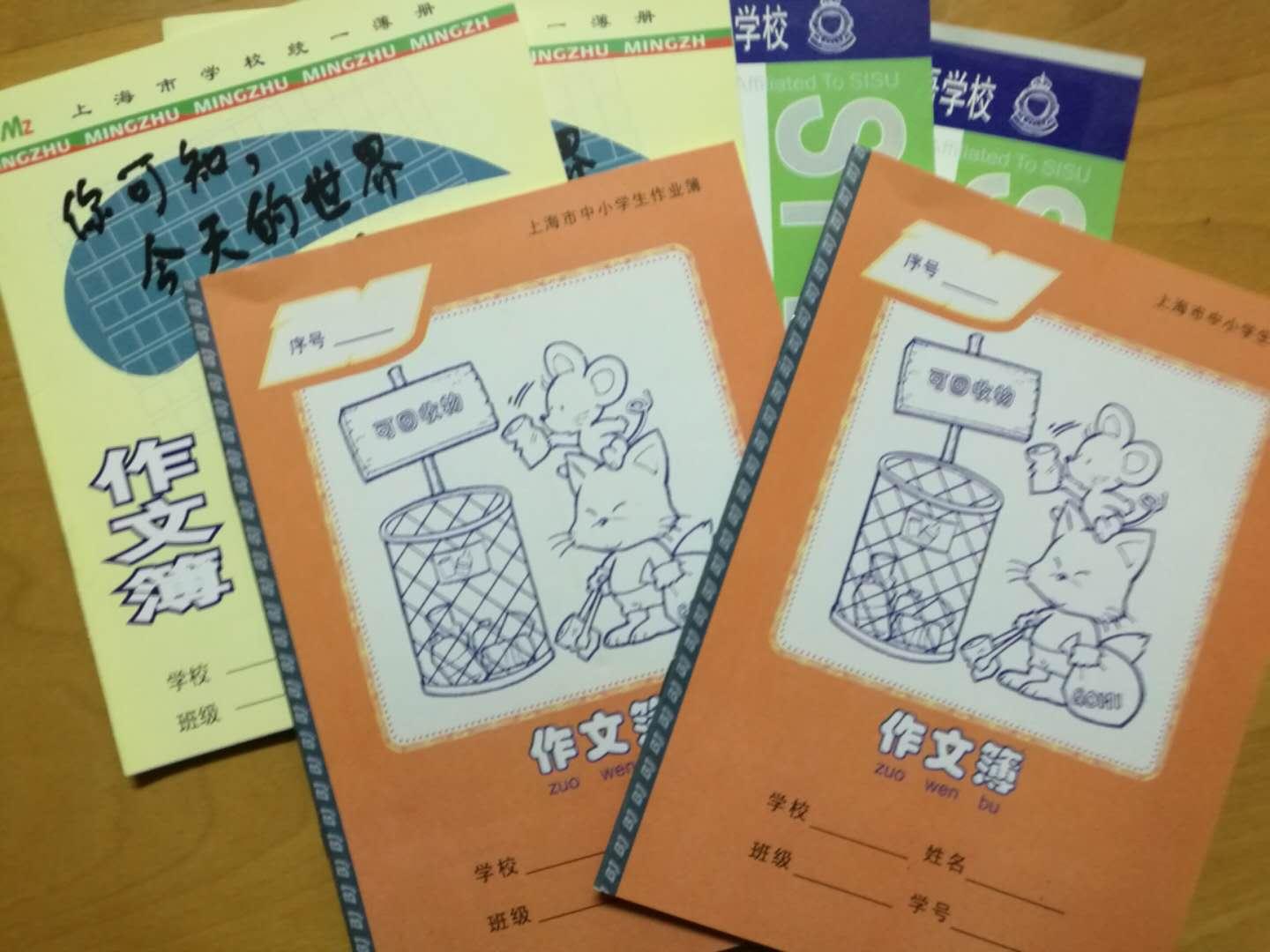 浦东新区某小学这学期发给读四年级的侯明轩(化名)童鞋语文作业本9本(作文本5本,每本14页;练习本4本,每本12-14页),其中有作文本2本没用过,还有2本分别剩7页,4页;练习本有1本没用过,其余分别剩4页,6页,8页。作业本处理方式如出一辙,学期结束后全部进废品回收站!