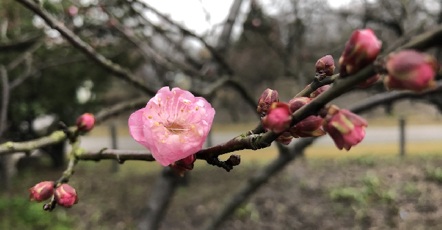 在这些“迫不及待”的“早鸟”之中,几株高大的‘丰后’梅开得最热闹,几乎已经满树粉色小花。