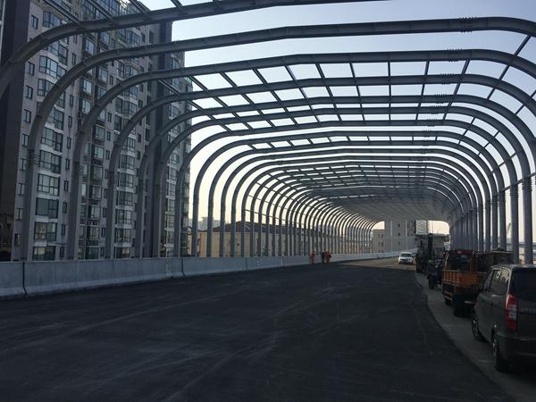 记者发现,建设者将“以人为本、绿色和谐”贯彻到施工中,他们在靠近办公、居住区一侧的匝道上安装了长402米全影型声屏障,有效减少了车辆在道路行驶中带来的噪音;还以“预制拼装”工艺为创新平台,成功应用预制双节立柱、预制大型盖梁、箱梁、预制防撞墙工艺和新型预制挡土墙等全新施工工艺。