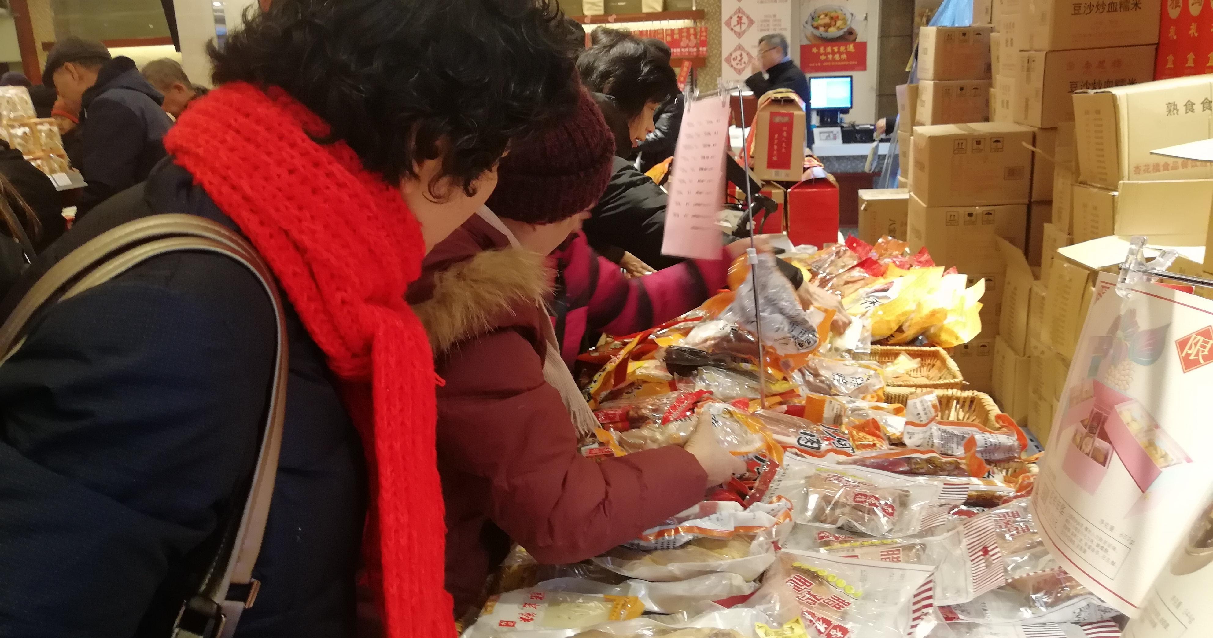 来买年货的人们把大厅填充得满满当当,买礼盒的、买糕点的、买半成品丸子的……如果想提前感受一下浓浓的年味,来这就对了。