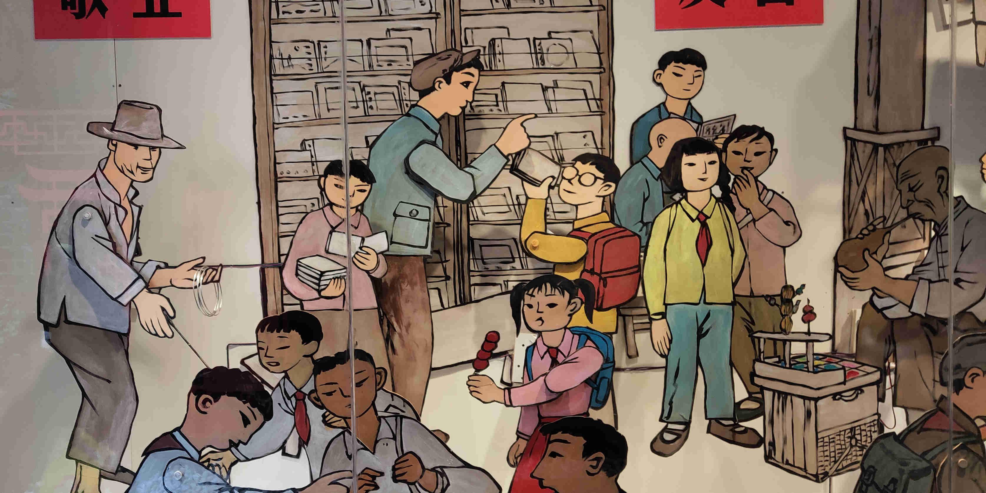 若在这幅连环画前待上一段时间,你会发现每隔数十秒,这里面的人物就会活动起来:摔倒的男孩四肢乱蹬、举弹弓的少年上下瞄准、和小贩攀谈的学生手舞足蹈……宛如一场大型皮影戏。十几秒过后,一切又归于平静,仿佛什么都没有发生过。
