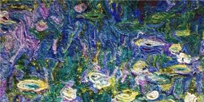 每天手工编结18个小时、历时两个月,孙颖棣终于完成了一幅1.1米*1.1米莫奈名画《睡莲》。在这幅画中,同样的线不超过三根,常常是一股线由好几种颜色拼成。一股线里还涵盖不同质地的线型,比如棉线、丝线、毛线、麻线等;一股线里线的形状,有粗有细还有大肚线等特种线,线的创新运用让这幅作品极具层次感。