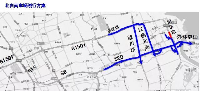 公安交警建议:施工期间,同济路高架北向南车辆可通过G1501富锦路下匝道行驶至同济路地面道路通行,南向北车辆可通过同济路高架水产路下匝道通行。同时,S20外环线、G1501郊环线及逸仙高架途径施工区域的车辆可通过江杨北路、蕰川路等周边道路进行绕行。