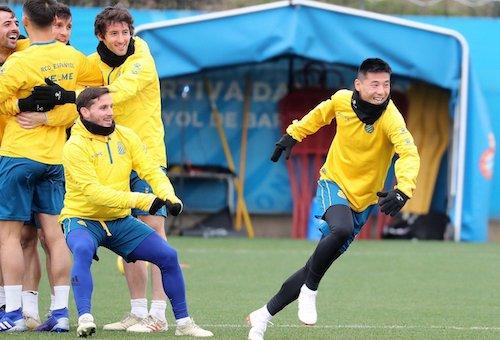 西班牙人在当地时间周六中午进行了赛前的最后一次训练,武磊在训练中十分轻松,和新队友们也已经是打成了一片。