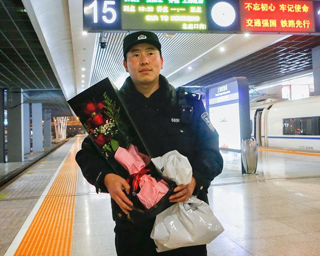 13日一早,梅姗姗正忙碌在从贵阳北站开回上海虹桥的列车上。值完大夜班的刘璞没有回家,他准备了一束玫瑰和一只警熊作为情人节礼物,在晚上18点22分准时出现在梅姗姗的列车厢门口。