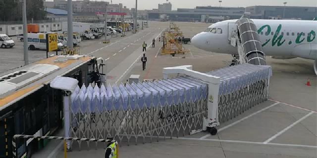 2月25日中午,计划从虹桥机场飞往厦门的春秋航班旅客惊奇地发现:刚下摆渡车,就有一条“长龙”——移动式廊道横卧在机坪上。廊道宽2米,高3米,拉伸长度最长可达25米,顶上带有雨棚,一端连接摆渡车的一道门,另一端连接客梯车。旅客穿过20余米的廊道,就直接到了客梯车面前,准备登机。