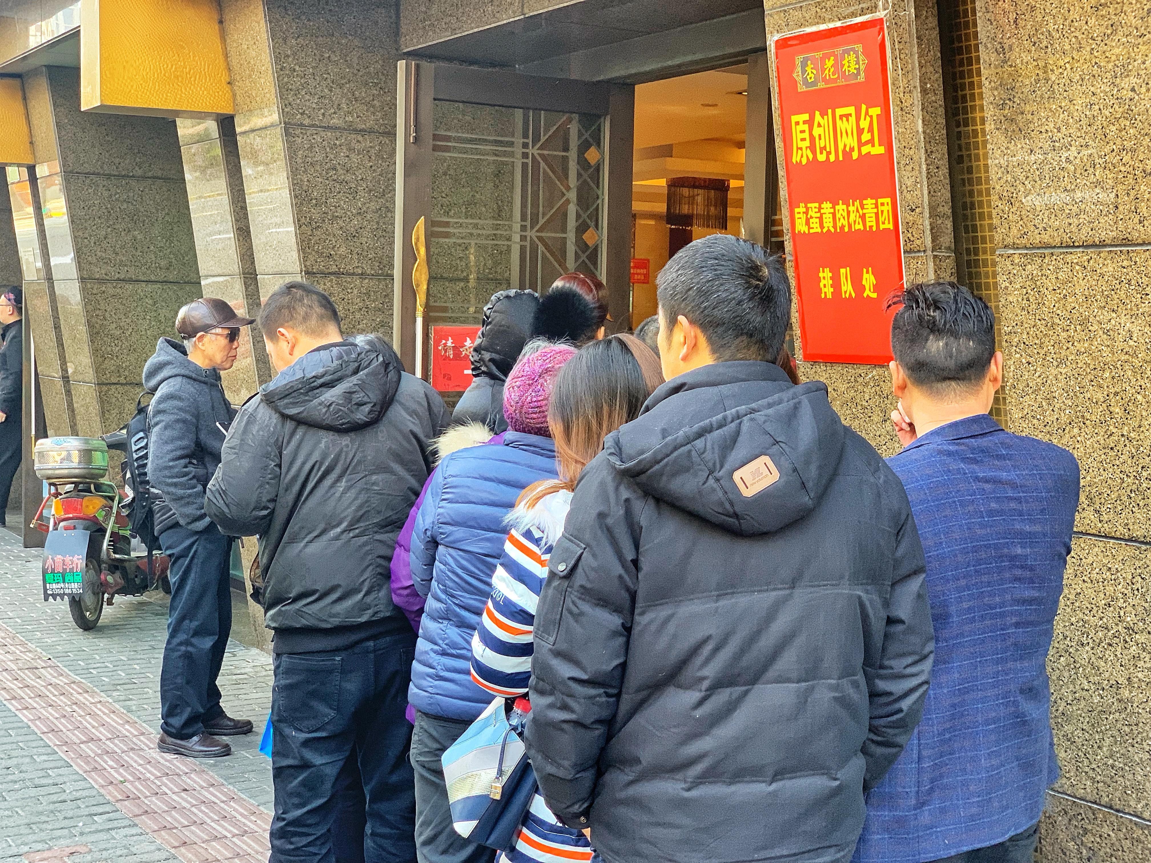中午11点左右,周到君到达福州路的杏花楼总店,可以看到在一块”原创网红——咸蛋黄肉松青团排队处“的红牌子旁边,已经有市民排队购买的的队伍了。但可能清明还早,所以队伍不是很长。一位店员告诉周到君,基本半小时左右就可以买到。