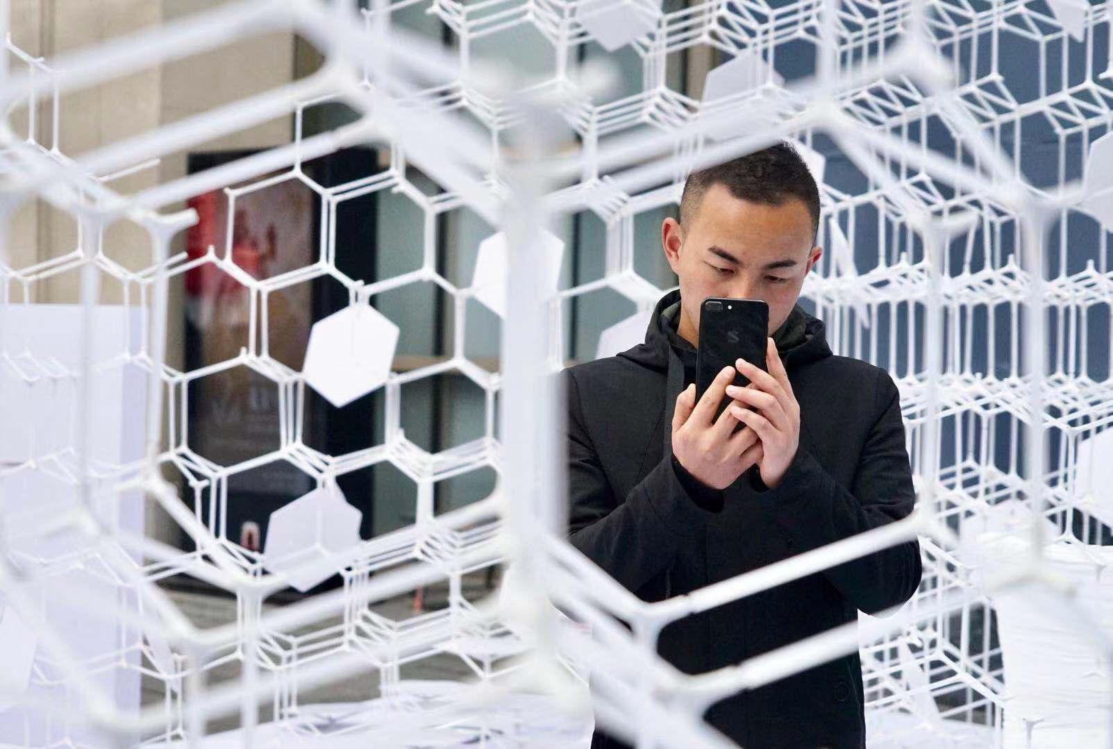 人与自然的互动启迪心灵,人与空间的互动则可实现多维度的交流。新天地北里入口处,由RSAA/庄子玉工作室创作的艺术装置“坛”城,将参观者引入光与影交织的空间里穿梭。直径五米的圆形迷宫中,不同的标高剖断出了平面形态和迷宫路径,使观者在其中产生各种交互和接触的可能。这正像人们从线上相识回归线下物理空间,在城市中不断探索自己的过程。在数字时代,人们的生活、工作与社交越来越呈现“碎片化”的场景。杨明洁所设计的“碎片化存在”空间装置将这种“碎片化”的虚拟形态可视化,在新天地南里广场建构了一个让观众身处其中可直观体验并思考的空间。交错迷幻的结构围合成一间“羊舍茶室”,让人思考每一个个体作为其中一个碎片,与这个万物互联的世界相互之间的关联。