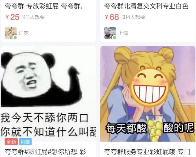 记者发现,有些电商平台已经推出了“夸人服务”,费用高低不等,有10元5分钟的,也有50元10分钟的;不仅如此,还有“夸夸群”在网上招人。