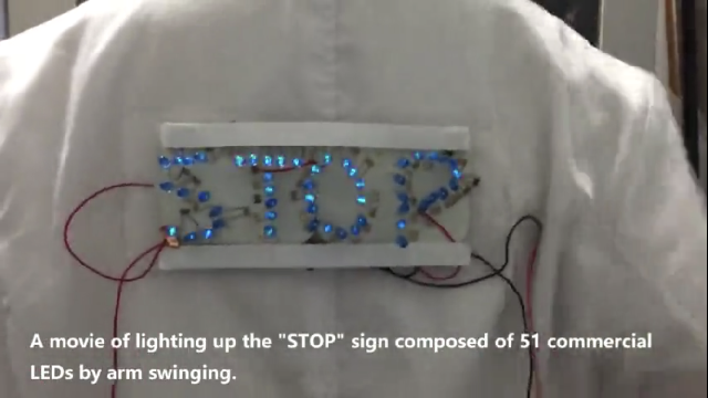 这种发电织物可以收集人走路摆臂时的机械能,产生交流电,摆臂一次灯就亮一下,
