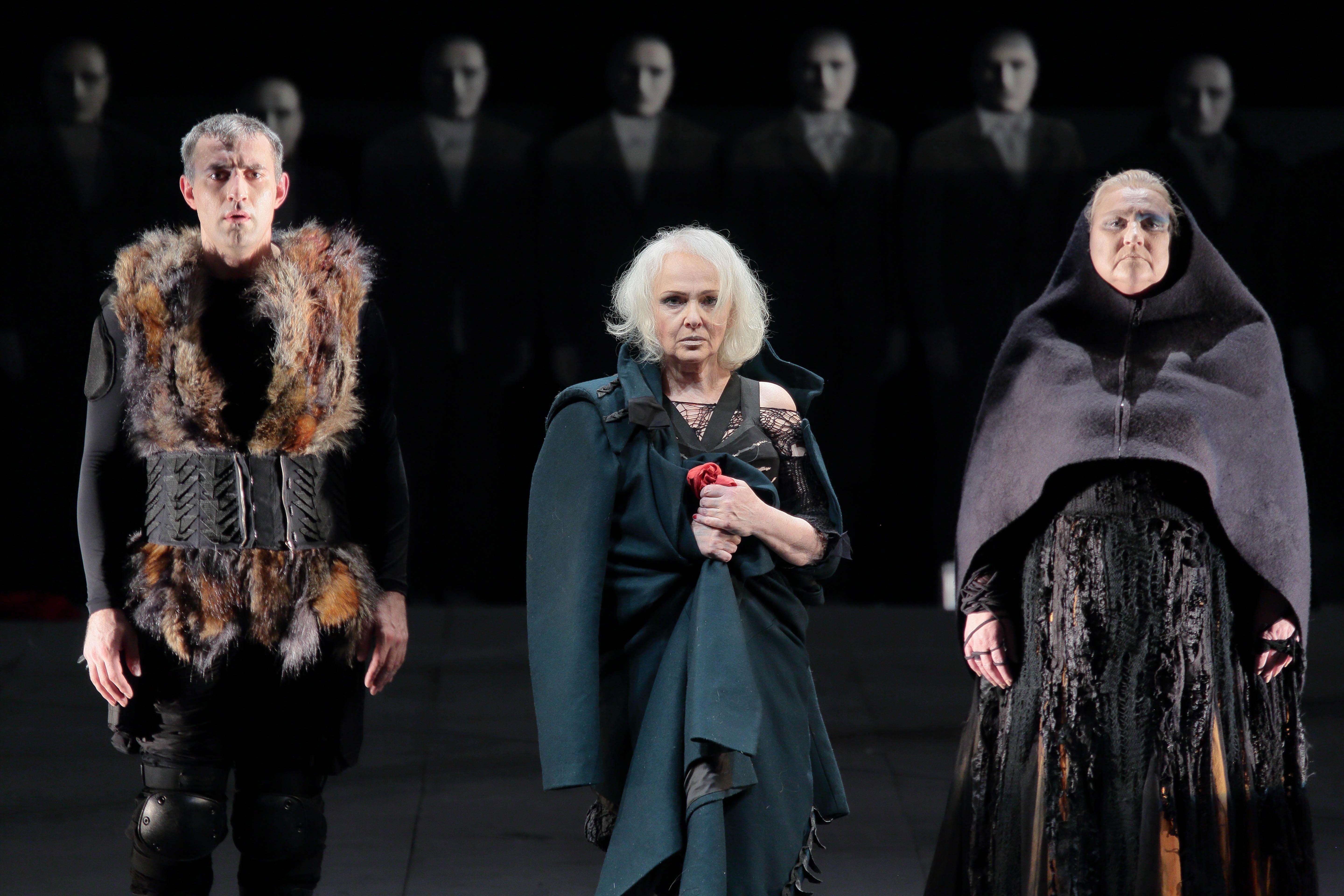 埃琳娜富有经验地将表演技巧融入内心体验,对人物的诠释细致入微且富有层次感。无论是台词、歌唱还是形体表达,都能服从于导演颇具特色的戏剧风格,其中多出情绪爆发点产生出饱满的戏剧力量,感人至深。作为一个有年龄跨度的角色,“大胆妈妈”最后的苍老形态以及悲怆情绪,被埃琳娜处理得不动声色而令人信服。