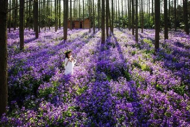 排排整齐的水杉下,成片的紫色二月兰,超级浪漫。置身于此,拥抱这一整片花海,美极了。