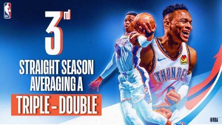 此外,威少连续三个赛季完成场均三双的惊人表现,也让他成为了NBA历史首人。