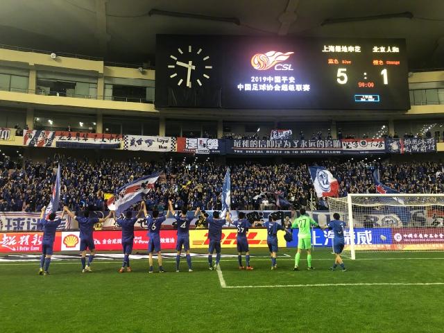 申花最终5:1大胜人和,当主裁吹响全场比赛结束哨声的时候,没有人离开,大家等待着新的高潮,申花队员绕场一周谢场,而当比赛中打入打破僵局的进球,将自己在申花的进球数扩大为65球,超越谢晖成为申花队史射手王的莫雷诺,穿上提前准备好的65球纪念衫,来到球迷看台下致谢的时候,球迷们高喊“gio,gio”,场上场下完美互动。