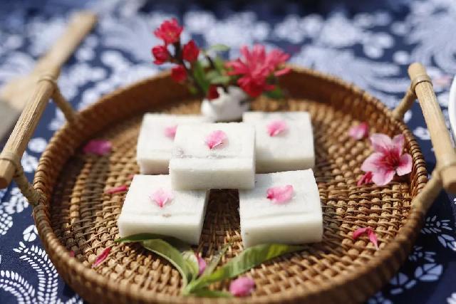 品尝桃花糕,您能感受到米粉、豆沙、桃花三者奇妙的融合