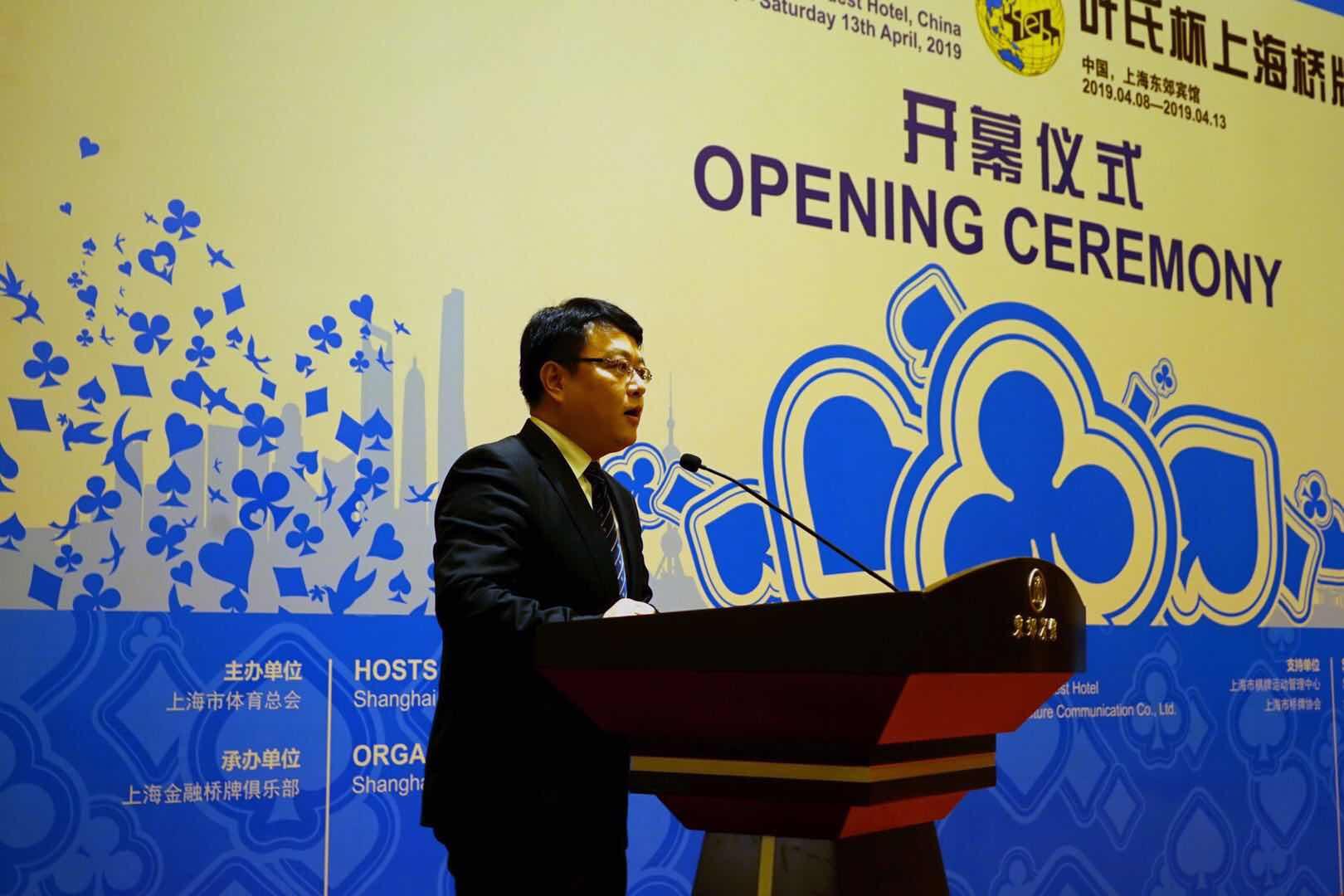 上海市体育局局长、上海市体育总会主席徐彬、中国桥牌协会副主席徐双未、本次叶氏杯冠名赞助商叶澄、上海金融桥牌俱乐部理事长潘志纯、上海市桥牌协会会长邱伟昌、上海市体育总会秘书长杨国浩等领导和嘉宾出席开幕式,徐彬宣布比赛开幕。