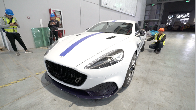 白色车身,中间有醒目的蓝色装饰线条,Rapide E在本次车展上是全球首秀。搬运工人们用人手滚动轮胎,一步步“护送”出集装箱,小心翼翼地移送至展位。Rapide E的全球首秀,体现阿斯顿·马丁豪车品牌拥抱绿色新能源的环保潮流。