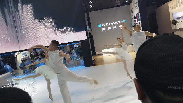 7号馆的天际汽车就请了一个芭蕾舞团。两对男女在展台的中心区域,伴着有力的音乐不停地翻转、跳跃。旁边则是本次车展他们的主打车型。这热烈的氛围和动感十足的舞蹈吸引了很多观众,他们几乎都拿着手机在拍照、录像。