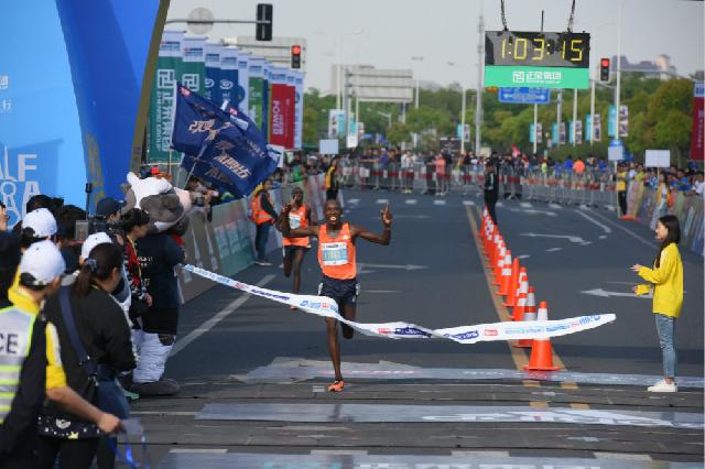 相比去年的烈日炎炎,今日天公作美,早7点至10点间,天气阴短时阵雨,气温19-22摄氏度,空气质量始终维持在良及以上。来自埃塞俄比亚的男选手Antenayehu Dagnachew YISMA率先冲过终点线,以1:02:32的成绩夺得冠军;同样来自埃塞俄比亚的女选手Bedatu Hirpa BADANE与Yenenesh Tilahun DINKESA竞争异常激烈,两人冲线时间同为1:12:10,最终经计时芯片与裁判员反复确认,Bedatu Hirpa BADANE凭1:12:10.20的成绩领先Yenenesh Tilahun DINKESA 20毫秒,成为女子组第一。