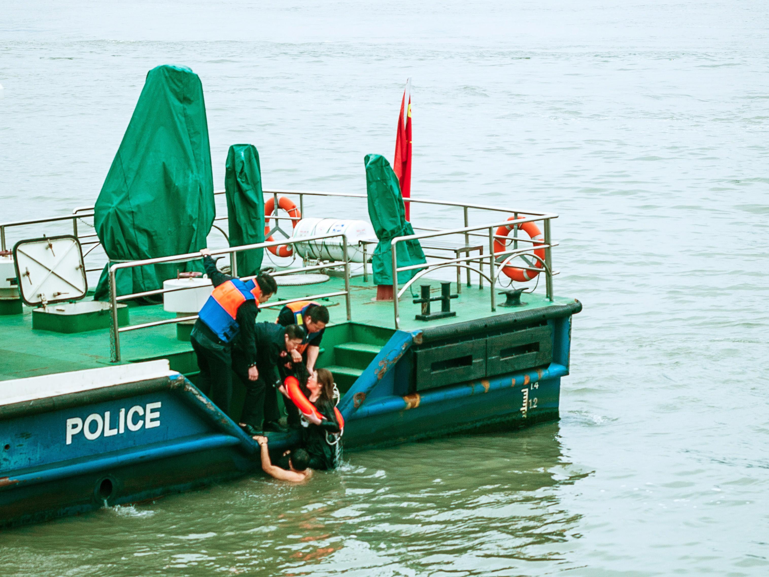 接警的公安救生艇也火速驶来,干警们抛出带绳索的救生圈。救人的小伙先把救生圈套在跳江女子身上,干警们拉着绳索,小伙子则推着救生圈靠上救生艇。船上的干警与小伙子合力将跳江女子救上船,而后干警们又把小伙子和救人的大叔也拉上了船。